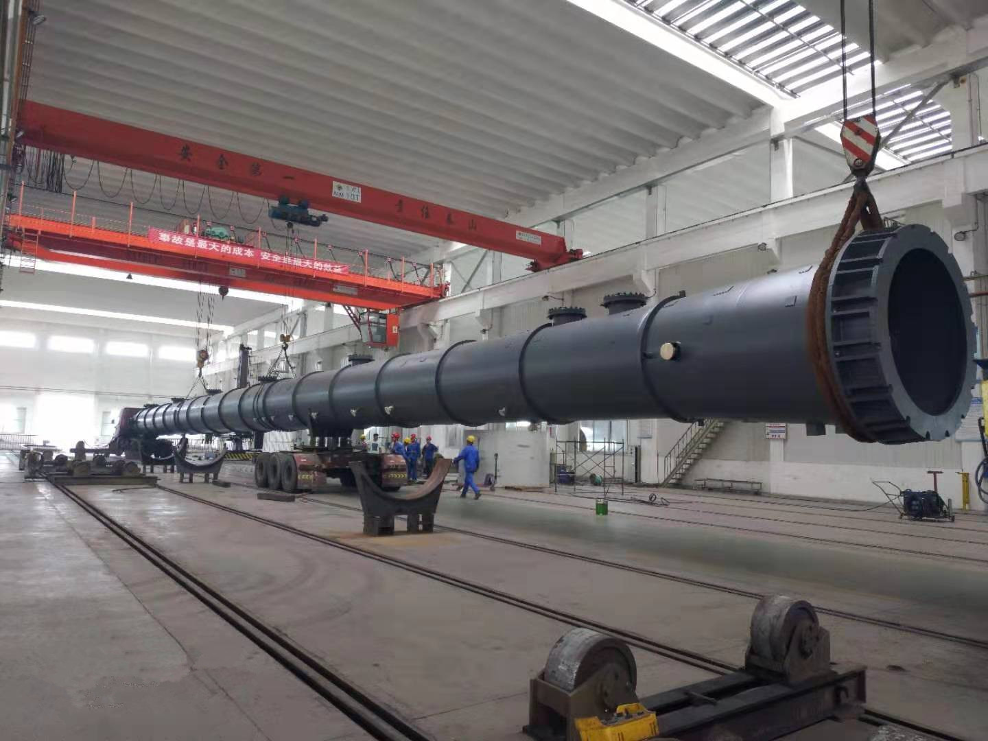 塔器全長51.4米,直徑1.8米筒體主體采用埋弧自動焊,支管法蘭采用氬弧焊打底、電弧焊填充蓋面,保溫圈采用二氧化碳保護焊,涵蓋了壓力容器所有的焊接技術(shù)和裝配技巧。